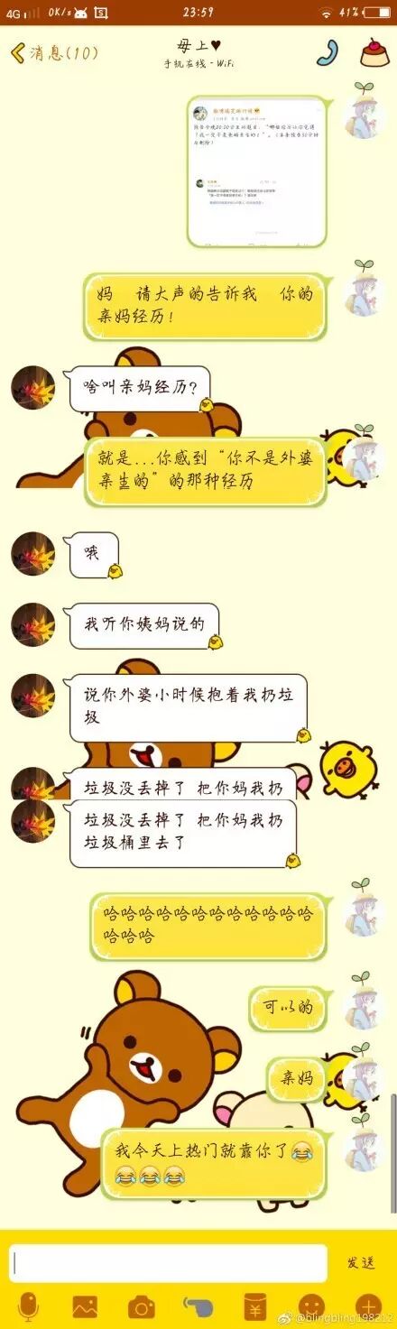 ►有一次电视突然冒烟了 我妈让我去看看 还有一次冰箱漏电了 我妈让我过去看看 还有一次我家好像进贼了 我妈让我拿刀去看看 最让人想死的是:18岁生日她只给我说了一句话 : 孩子 成年了哟 可以坐牢了哟。