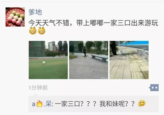 ►我爸妈去遛狗,然后发的朋友圈,一家三口,他们和狗