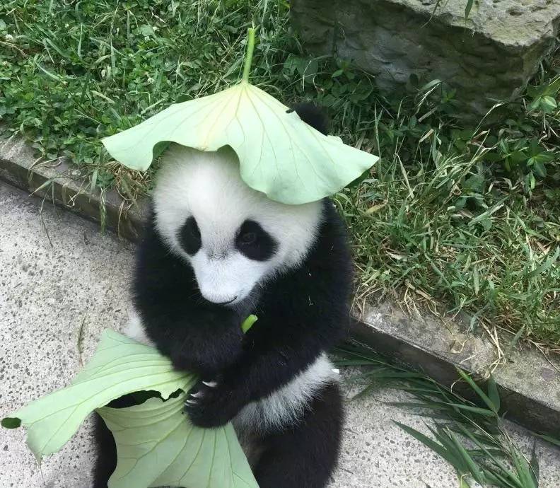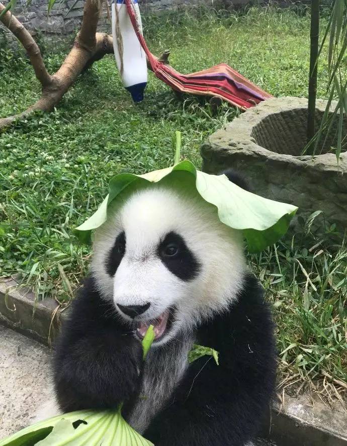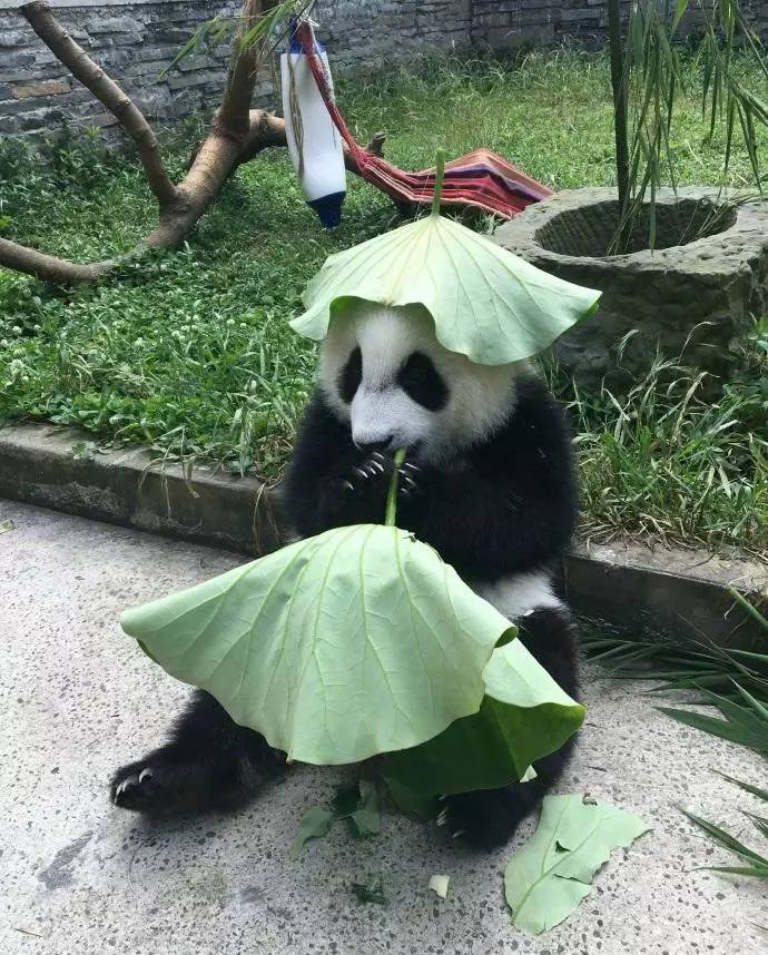 戴着荷叶的大熊猫真的好乖萌啊,还给荷叶掏了两个洞露出耳朵,这可能是我见过的最可爱的绿帽子了......