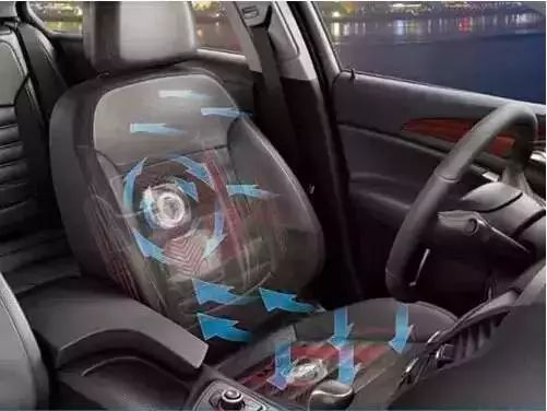 真皮打孔+通风:座椅通风是在座垫里头内藏小风扇,往你PP上吹。所以通风和打孔是必须共存的。有通风的打孔真皮座椅,夏天坐多久都不会觉得发热,是非常实用的好功能。
