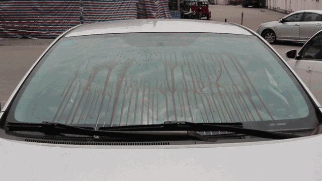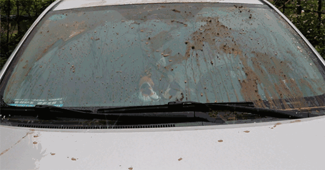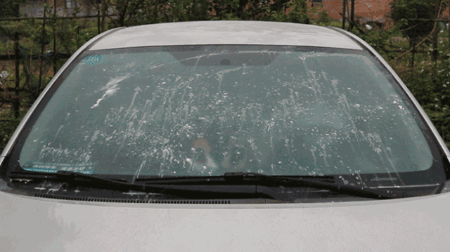 经多次刮洗,最终也未能将玻璃擦干净,仍然留有明显印迹。前挡风玻璃上的鸟粪以及油污,自来水清洁作用很有限。